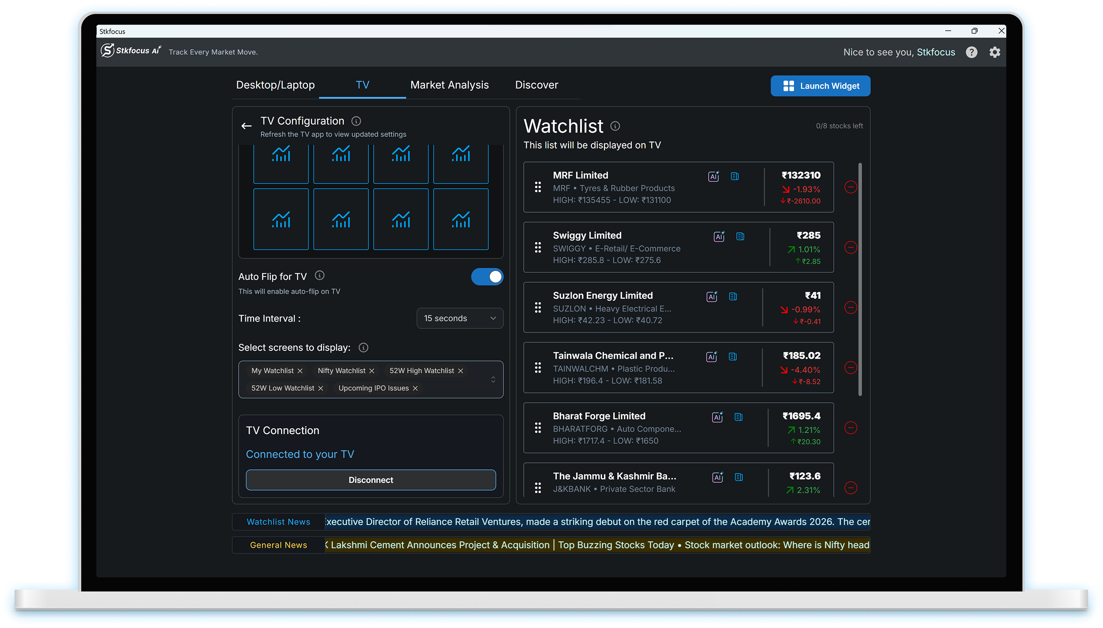 Monitor market trends, watchlists, and stock movements on your TV. Connect with the Stkfocus mobile and desktop apps to access AI-powered analysis, stock news, and competitor insights.